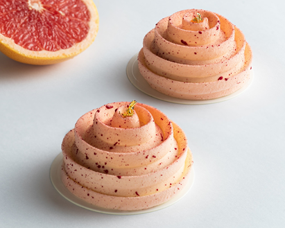 將葡萄柚從皮到果肉完整入甜點的葡萄柚起司蛋糕,則是藉由葡萄柚果凍、葡萄柚果醬等不同的處理法,呈現葡萄柚果肉的酸甜和天然柑橘類精油的悠遠香氣,層疊質地不同的起司蛋糕和慕斯,在雅緻的起司奶味烘托之下,葡萄柚酸甜的風味更加明亮卻也更圓潤。