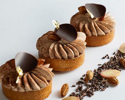 榛果巧克力香料焦糖塔的內餡中,加入了榛果、辛香料等,讓巧克力的香甜更為深邃悠遠。 |