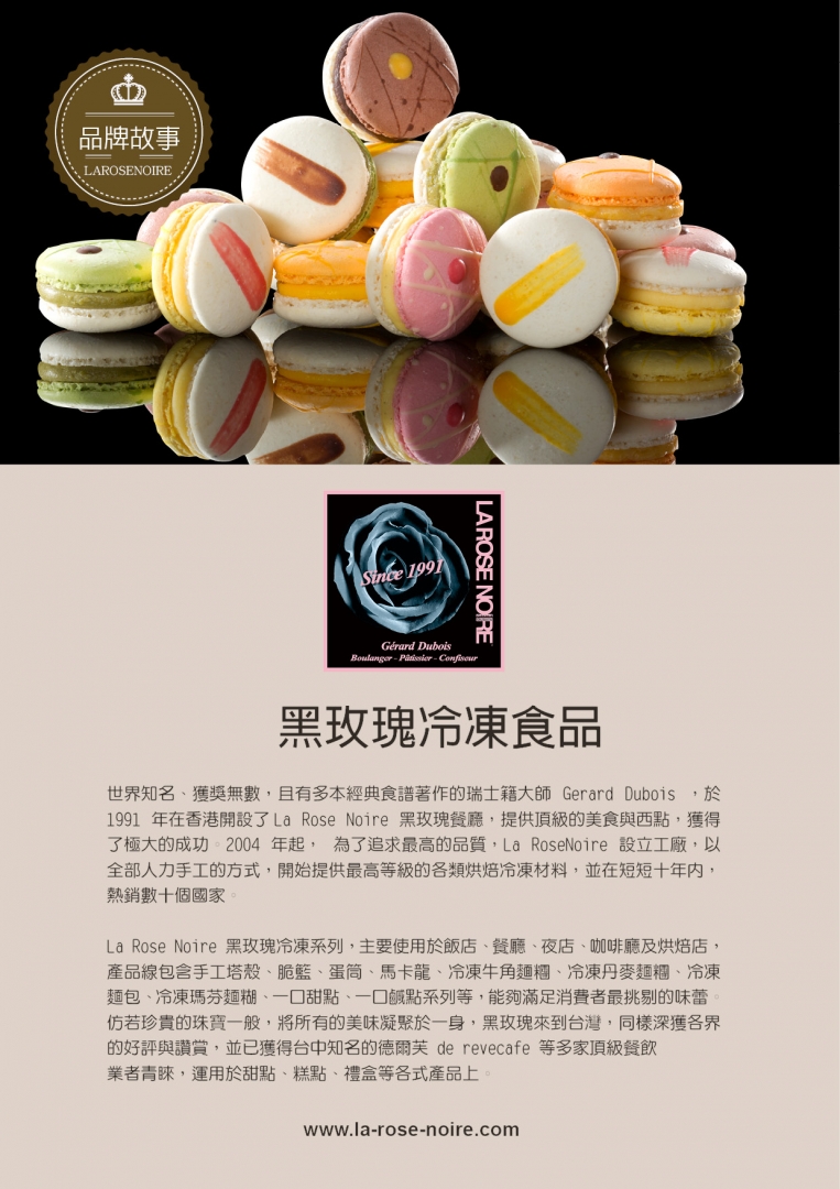 世界知名、獲獎無數,且有多本經典食譜著作的瑞士籍大師 Gerard Dubois ,於1991 年在香港開設了La Rose Noire 黑玫瑰餐廳,提供頂級的美食與西點,獲得了極大的成功。2004 年起, 為了追求最高的品質,La RoseNoire 設立工廠,以全部人力手工的方式,開始提供最高等級的各類烘焙冷凍材料,並在短短十年內,熱銷數十個國家。